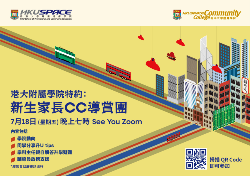 歡迎登陸HKU SPACE CC!為讓大家更了解CC,學院將於7月18日(星期五)晚上7時於Zoom舉辦新生家長導賞團。我們將分享學院最新動向、和升U心得、學部主任更會親自解答大家的疑問,萬勿錯過!